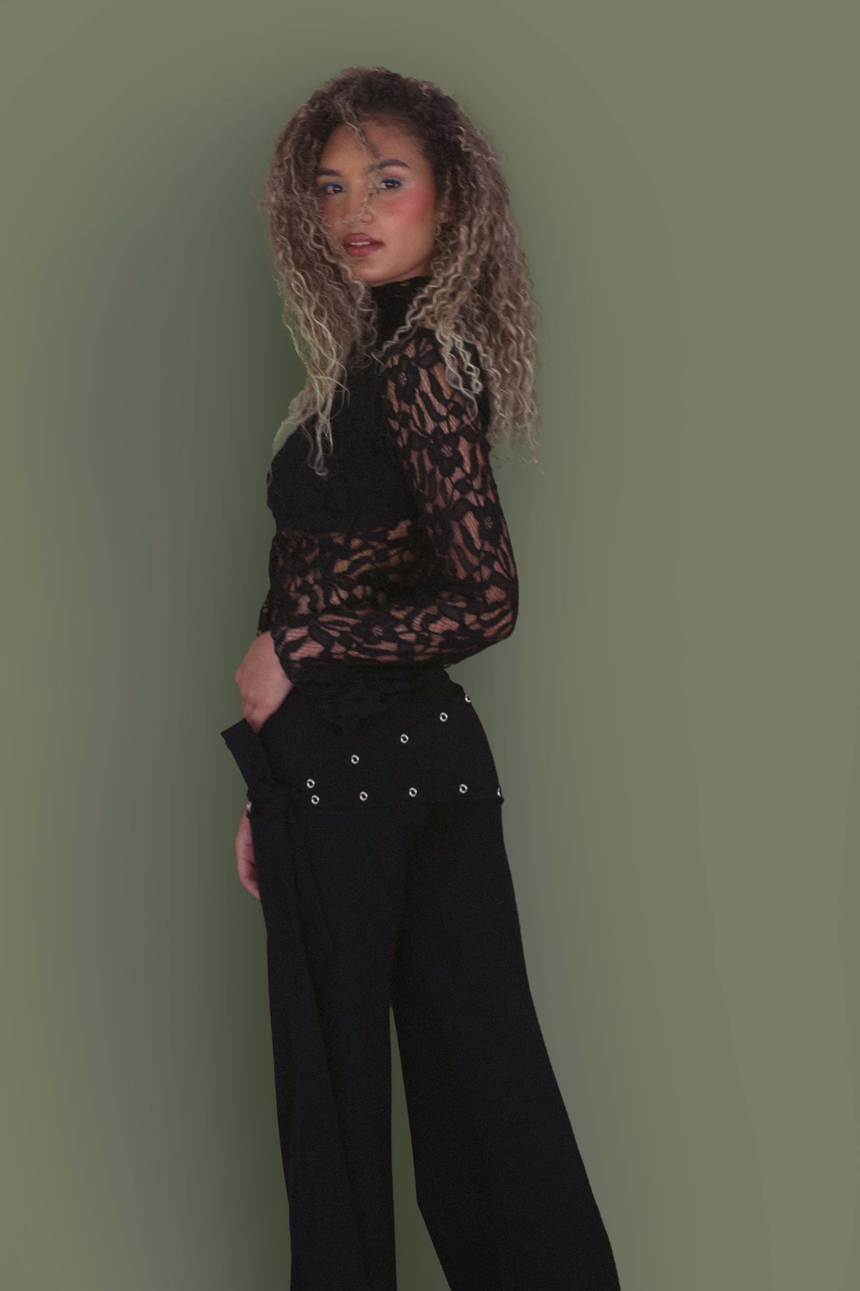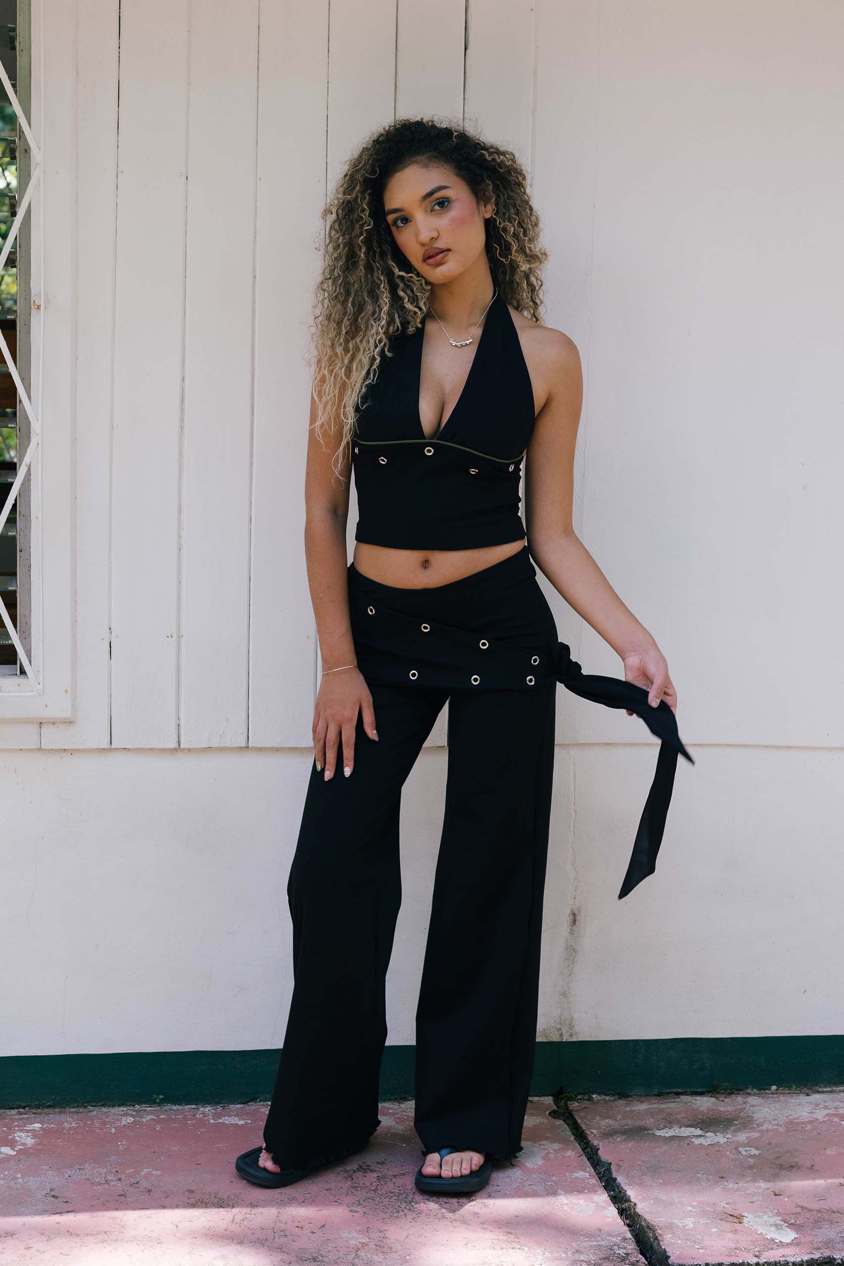 The Stevie Pants are a low-waist bell-bottom style designed for going out. Featuring a sarong-style wrap with side eyelet ties for adjustable styling.